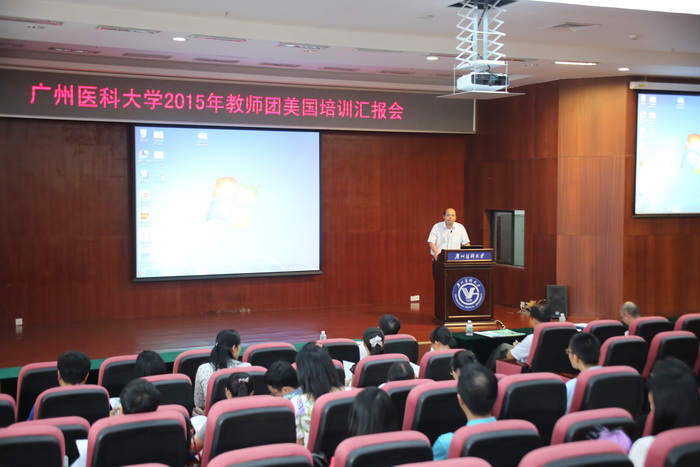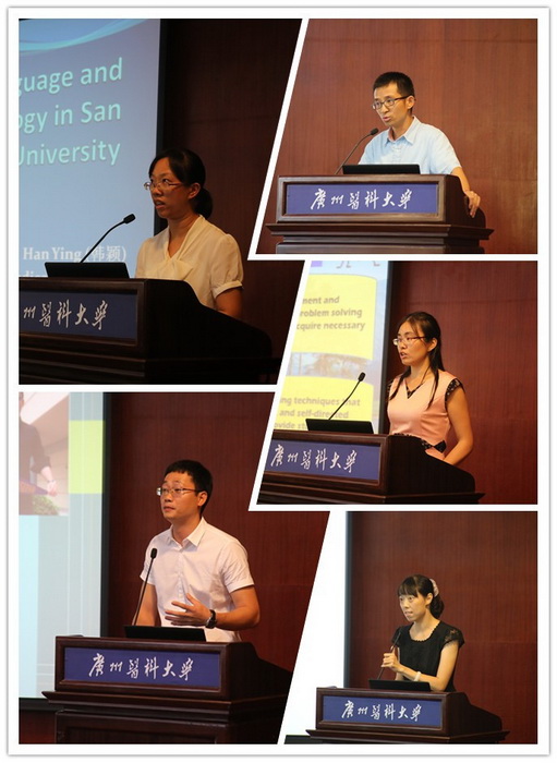 韩颖、张根水、陈爱兰、王芳、马钊恩5位出国培训的教师代表分别用英文作了汇报,介绍他们在美国学习体会,并讲述了各自在专业领域的收获及感想。