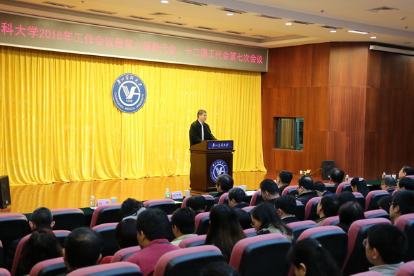 王新华校长作题为《解放思想 真抓实干 努力开创高水平医科大学建设新局面》的工作报告,并对学校“十三五”事业发展规划的制定作说明。报告简要回顾了2015年学校发展建设中取得的11项主要成绩,并指出了存在的不足。王校长指出,2016年要抓六项重点工作,为“十三五”发展开好局,今年全校工作的总体思路是:深入学习贯彻党的十八大和十八届三中、四中、五中全会以及习近平总书记系列重要讲话精神,紧紧围绕学校“十三五”发展规划战略布局,全面深入落实学校高水平大学建设方案,坚持改革创新,强化内涵建设,落实从严治党,提升学校综合实力,为建成高水平教学研究型医科大学奠定坚实基础。