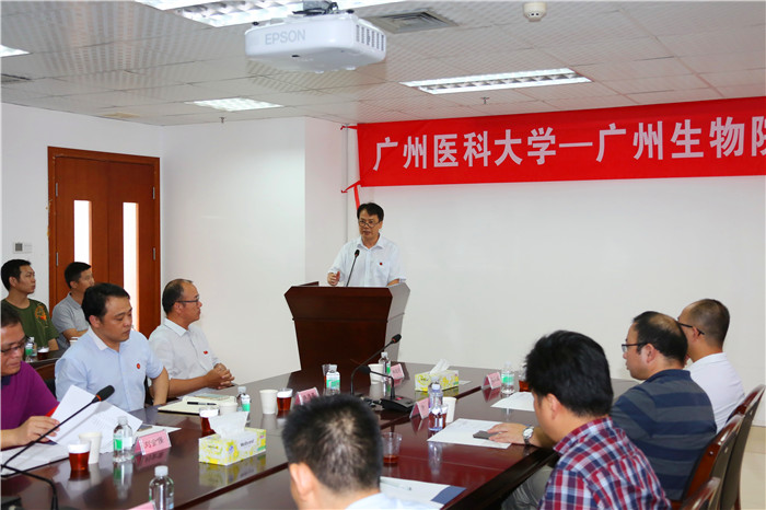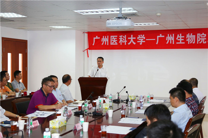 校长王新华致辞,他回顾了广医与广州生物院持续多年的良好合作关系与系列合作成果,双方共建高水平大学和高水平研究院得到了广州市委市政府的高度认可和深切期待。其中,联合共建生命科学学院,培养具有创新精神和科研能力的生物医药技术领域优秀人才,是双方贯彻落实全面战略合作协议的重要内容和有效举措。ac米兰生物技术本科专业已有12年办学历史,为高水平大学建设五大重点学科群之一的基础医学学科群的重要支撑,具有广阔的发展前景。广州生物院拥有高水平的科研人才和科研平台,在干细胞理论和应用研究、细胞分化、疫苗和抗体药物等方面具有国际先进研发水平。双方共建生命科学学院,可以资源共享、优势互补和共同发展,既可有效提升生物技术人才的培养质量和相关学科的发展,积极促进高水平大学建设;也能有利于教研相长,提升广州生物院的科研实力和成果转化能力,更好地为国家和区域经济发展服务。希望双方形成合力,在师资队伍建设、人才培养、学科建设、科学研究等方面大胆开展探索和实践,将生科院建设成为校院合作办学的典范。