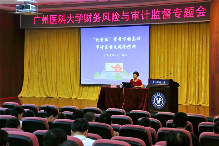 9月13日上午,学校在番禺校区召开财务风险与审计监督专题会议,王新华校长主持会议并讲话,广东省审计厅教科文审计处处长林红做了题为《“放管服”背景下的高校审计监督与风险防控》的讲座,学校审计处处长陈怡璇通报了广东省审计厅对学校高水平大学建设专项资金审计的情况。各直属附属医院分管审计、科研工作的领导,各二级学院的有关领导,学校和直属附属医院监察、审计、财务、科研、采购、设备等部门的人员,以及2012年以来立项的部分在研科研项目负责人等共260多人参加了会议。