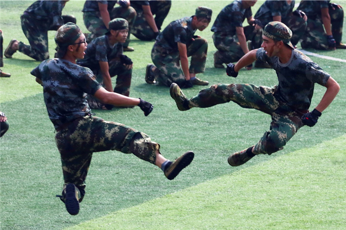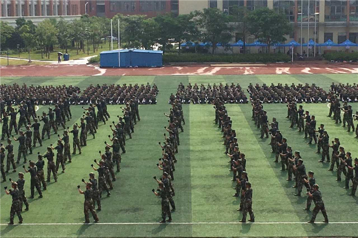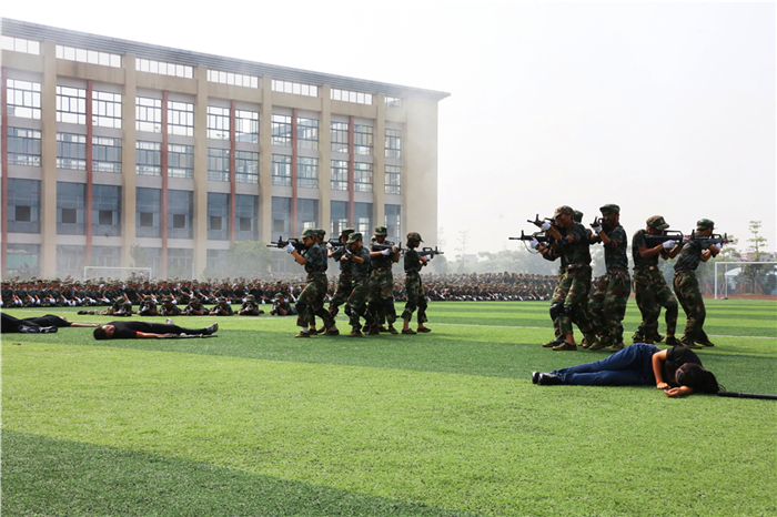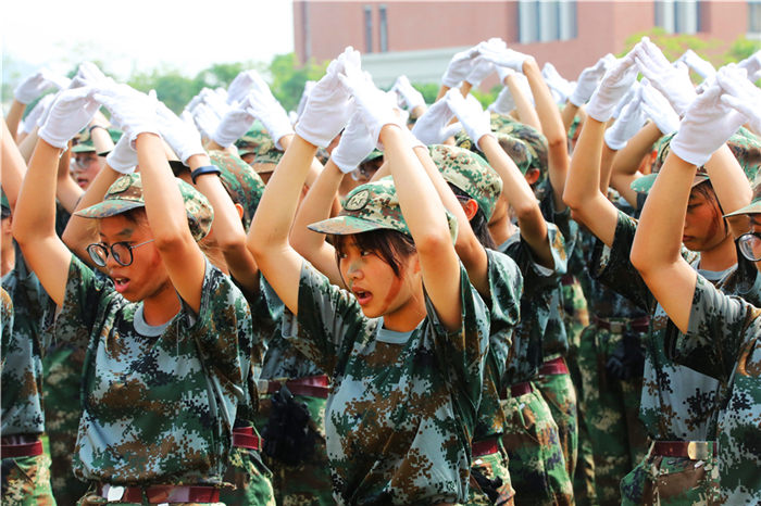 分列式中,2017级新生组成6个方队依次经过主席台。他们精神抖擞、步伐铿锵,严肃的军容、飒爽的英姿展现了广医大新一代学子朝气蓬勃的风采。随后进行的擒敌拳表演、战术反恐演练等更是赢得了阵阵掌声。最后,全体同学共同完成了手语操《国家》的表演,展现了广医大学子爱国、爱家、爱校的情怀。