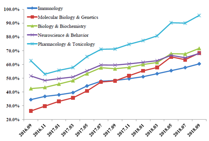 潜力学科阈值迅速攀升。五个主要潜力学科近一年来进步显著:药理与毒理学比2017年同期提升24.33%,生物与生物化学提升20.16%,分子生物与遗传学提升14.71%,免疫学提升12.09%,神经科学与行为学提升8.39%。其中药理与毒理学阈值已达95.52%,有望在近期内跻身全球前1%。