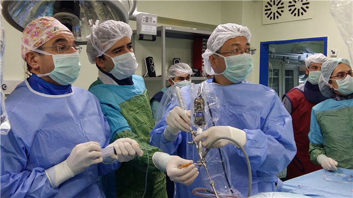 吴阶平泌尿外科医学奖获得者曾国华教授(左三)向外国专家演示smp超微通道经皮肾镜取石术