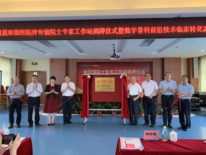 中国工程院钟世镇院士、南方医科大学欧阳钧教授,佛山市卫健局谭光明调研员、顺德区招霞红副区长、乐从镇冼英伟镇长、乐从镇卫计局崔兆林常务副局长,ac米兰官方网站刘金保副校长、附属顺德医院王治伟院长等共同为工作站揭牌