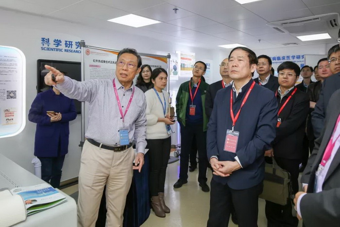 徐南平副部长一行参观了中心生物资源库和产学研展览室,郑劲平教授讲解了临床中心概况及生物资源库建设,钟南山院士、邓方阁教授、周荣教授等分别介绍了I类新药、吸入药物、红外检测技术、3D裸眼技术、院感防控技术等临床研究中心创新成果的研发转化情况。