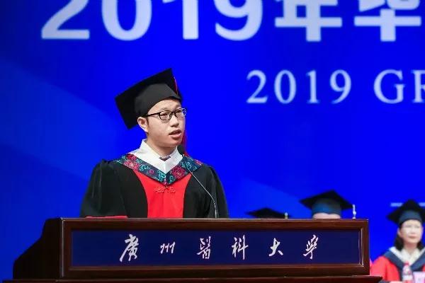 临床病理学与病理生理学专业博士研究生廖宇宁代表毕业生发言,对母校和师长表达最崇高的敬意和真挚的感谢。他认为,论文和学位帽不足以概括在广医的这段人生经历,更重要的是对看待世界的思维方式、探索世界的方法体系、改造世界的胆识魄力的培养塑造。