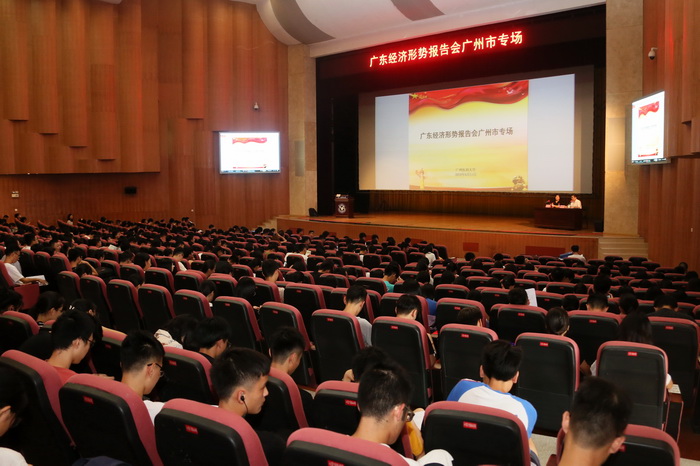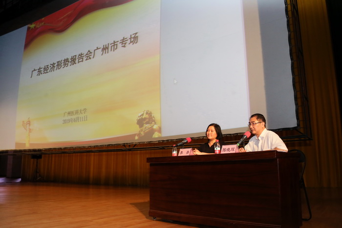 广医在线讯 6月11日下午,广东经济形势报告会广州市专场在ac米兰番禺校区礼堂举行。广州市经济形势报告团专家成员、广东外语外贸大学“21世纪海上丝绸之路协同创新中心”主任、广东国际战略研究院秘书长李青教授受邀主讲。ac米兰党委副书记陈晓辉主持报告会。