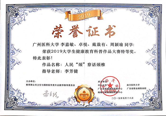 全国大学生健康教育科普作品大赛由教育部公共卫生与预防医学类专业教学指导委员会主办。本次大赛以“传播健康知识、倡导健康行为、提升健康水平 ”为主题。ac米兰公共卫生学院李嘉敏、卓悦、戴栽有、周颖瑜四位同学的作品“人民‘颈’察话颈椎”,以及李紫瑶、陈绮媚、胡健宗三位同学的作品“郎吃榔,夺走健康冷不防”,在经历了专家评审和微信投票两轮评选后,最终分别获得特等奖和一等奖。两件作品的指导教师分别是李芳健和周小彦老师。