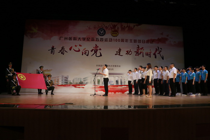 在重温《入团誓词》环节,学校团委曾王兴书记带领各学院团委、各附属医院团委的团干部和团员代表,面向团旗庄严宣誓。