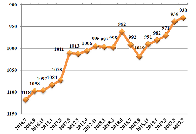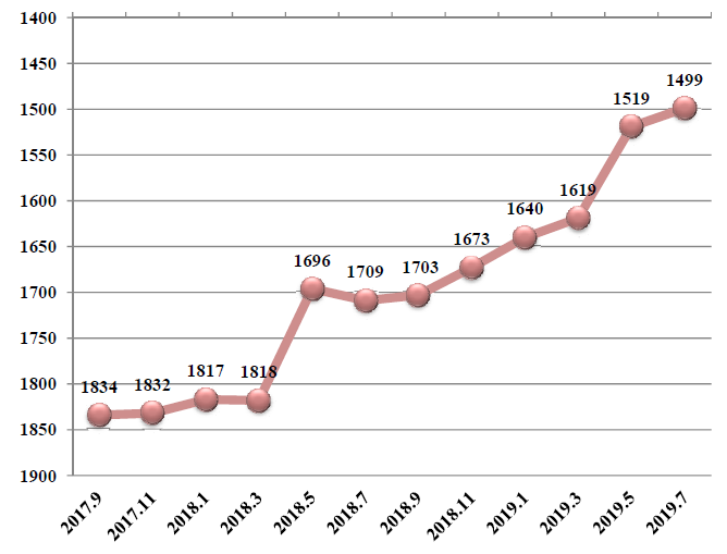 ac米兰ESI全学科综合排名趋势图(2017.9-2019.7)