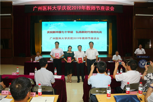 广医在线讯 庆祝新中国七十华诞,弘扬新时代尊师风尚。在第35个教师节前夕,学校于9月9日在番禺校区举行2019年教师节座谈会。校领导王新华、陈杰、罗健东、黄健清、胡丙杰,教师代表,以及各学院、附属医院、职能部门负责人参加会议。副校长黄健清主持会议。