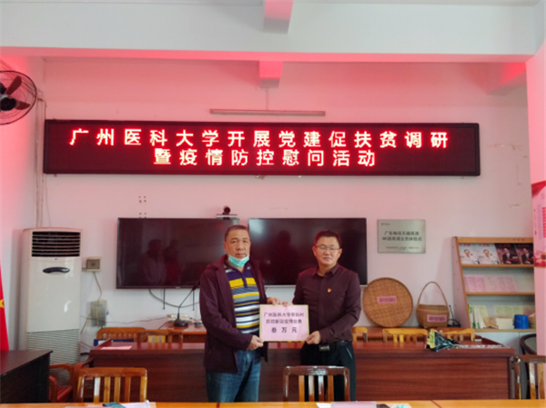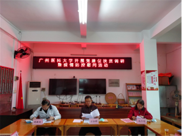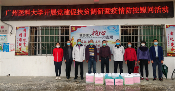 广医在线讯 为认真学习贯彻习近平总书记重要指示批示精神,严格按照上级有关文件精神和各级部署,紧紧狠抓疫情防控和脱贫攻坚工作落实,3月4日,学校党委常委、副校长方灿辉带队,学校工会副主席、扶贫办主任冯卫东,学校附属第五医院院长周新科,以及学校工会和附五院有关同志一行到访学校定点扶贫单位——清远市佛冈县汤塘镇高岭村,开展党建促扶贫调研暨疫情防控慰问活动。高岭村驻村干部和村两委干部参加活动。