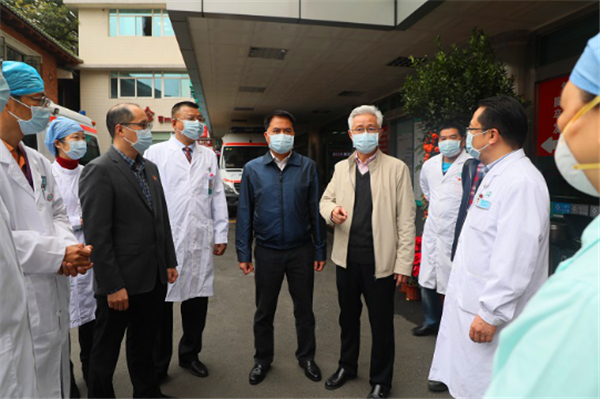 广医在线讯 1月25日,大年初一,学校党委书记冉丕鑫、副校长黄健清带领医管处负责人前往附属医院调研指导新型冠状病毒感染的肺炎防控工作、慰问一线医务人员。