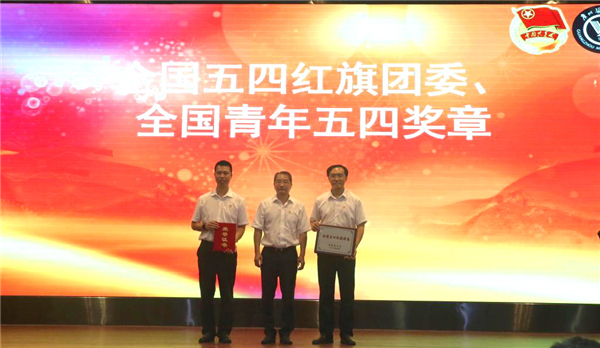 学校党委副书记陈晓辉向学校团委书记曾王兴颁发“全国五四红旗团委”奖牌,并为桑岭同志的代表、附属第一医院团委书记莫明聪颁发“中国青年五四奖章”证书。