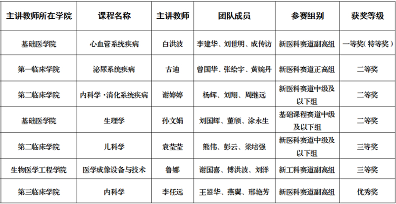 其中,基础医学院白洪波副教授《心血管系统疾病》课程团队荣获新医科赛道副高组一等奖(特等奖),将代表广东省参加全国赛。