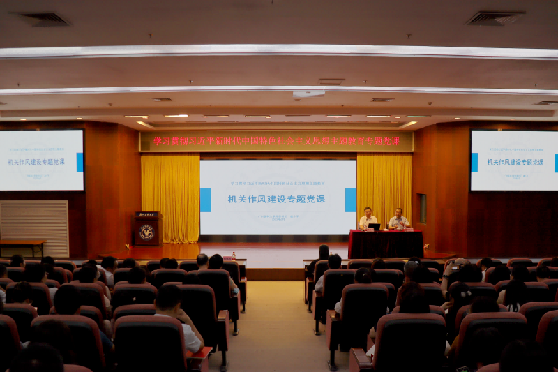 根据学校学习贯彻习近平新时代中国特色社会主义思想主题教育的部署要求,6月28日下午,学校党委书记唐小平在番禺校区图书馆报告厅为机关党委全体党员讲授专题党课,学校党委副书记、机关党委书记陈晓辉主持,省委第十八巡回指导组樊丽同志到场指导。