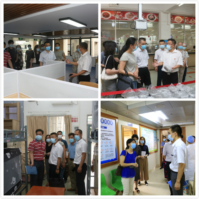 督查组分三组实地走访校园入口、校医室、图书馆、教学楼、食堂、学生宿舍、健康管理服务区,通过听取介绍、体验式检查和现场提问的方式了解重点场所的防控措施落实情况,并深入了解了学生分批返校预案、重点场所的抽疏安排、重点人群的管理服务、外国留学生的管理情况、对学生的心理疏导与人文关怀等事项,并现场提出指导意见。