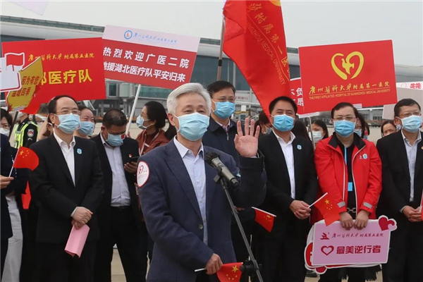广医在线讯 武汉解封之日,战士归来之时。4月8日,由广医一院副院长张挪富教授带领的、包括广医系统23名医务人员在内的广东支援武汉协和西院重症医学队和广东首位奔赴武汉驰援的国家卫健委专家队队员桑岭,在武汉鏖战了两个多月后,带着武汉人民的感谢与祝福,和广东同行一道乘坐航班回到广州。