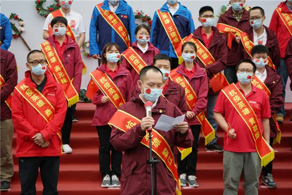 王新华校长代表学校热烈欢迎队员们平安回家。他说,你们是我们最大的牵挂,你们是优秀的白衣战士,你们是广医人的骄傲和榜样。在危难之际,你们响应党和国家号召,主动请缨逆行出征,投入武汉紧张的救治工作,精心呵护、全力救治,为武汉保卫战、为湖北保卫战、为全国疫情防控取得阶段性胜利贡献了广医智慧和方案。你们用自己的实际行动,在抗疫一线诠释了白衣战士的奉献精神,展现了共产党员的英雄气概,弘扬了广医大学精神,也给我们留下了宝贵的精神财富。同时也代表学校感谢队员们的家属。希望你们好好休整,以更饱满的精气神重返工作岗位,为顺利复工复产复学、为保障人民的身体健康作出更大的贡献。
