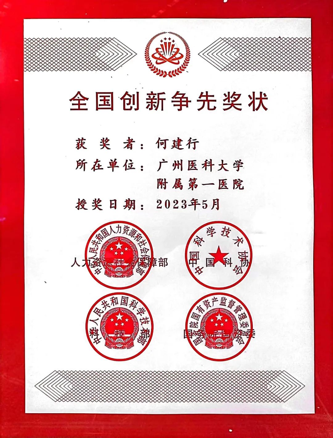 ac米兰附属第一医院国家呼吸医学中心主任、广州呼吸健康研究院院长、胸外科学科带头人何建行教授获第三届全国创新争先奖状。