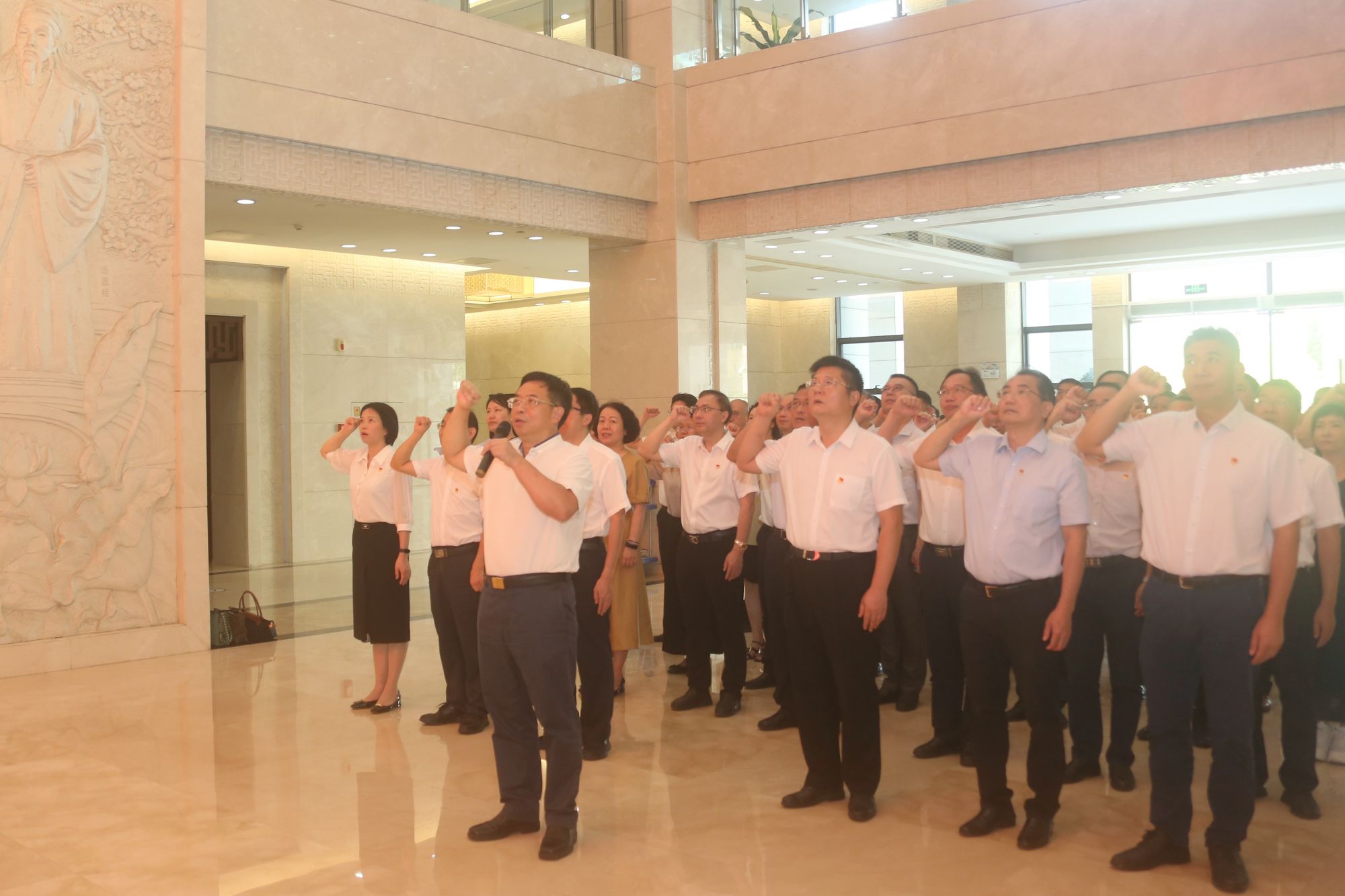 在参观大厅,鲜红的党旗前,全体同志整齐列队,庄严肃立,学校党委书记唐小平带领大家重温入党誓词,观看教育片《永远在路上》。