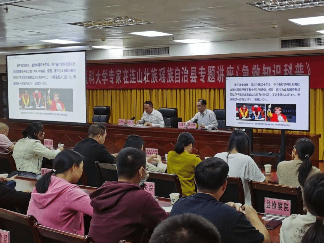 党委副书记陈晓辉以“急救知识科普”为题,面向连山县、镇、村干部开展专题讲座。在讲座中,陈晓辉副书记表示,一方面,人们在非医疗机构突发身体不适,若需要紧急医疗救护,作为第一目击者的旁人,能第一时间给予患者最基本的救助,以争取时间等待专业医护人员到场急救,尽量避免患者不良预后;另一方面,掌握急救知识对基层干部提升基层管理能力,保障人民群众生命安全具有促进作用。