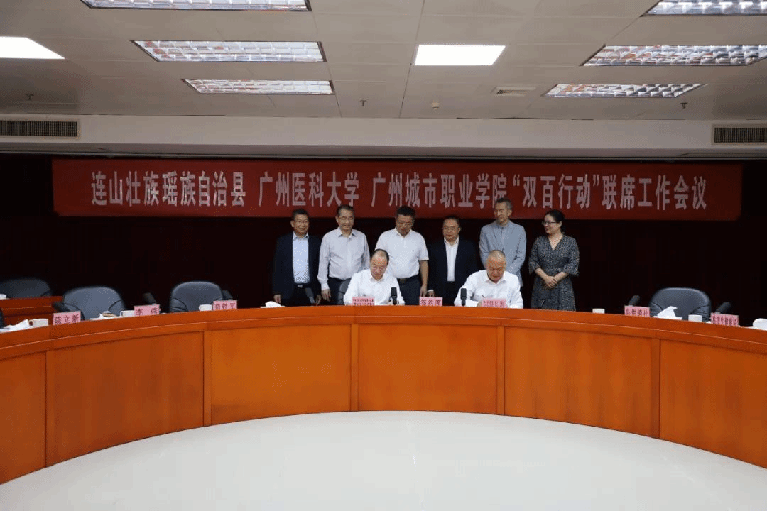 为深入实施百校联百县助力“百县千镇万村高质量发展工程”(以下简称“双百行动”)与基础教育对口帮扶,根据连山壮族瑶族自治县(以下简称“连山县”)与ac米兰官方网站(以下简称“广医”)、广州城市职业学院(以下简称“广城”)三方合作协议的要求和连山县的具体需求,10月15-16日,广医党委书记唐小平、副书记陈晓辉,以及办公室、医院管理处、教务处、工会、广医大资产经营有限公司、附属第六医院相关负责人等赴连山县与广城、连山县人民政府召开“双百行动”第二次联席会议,并开展专题调研。