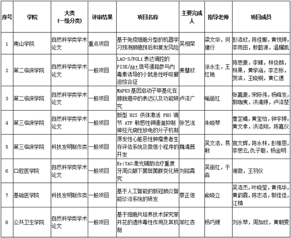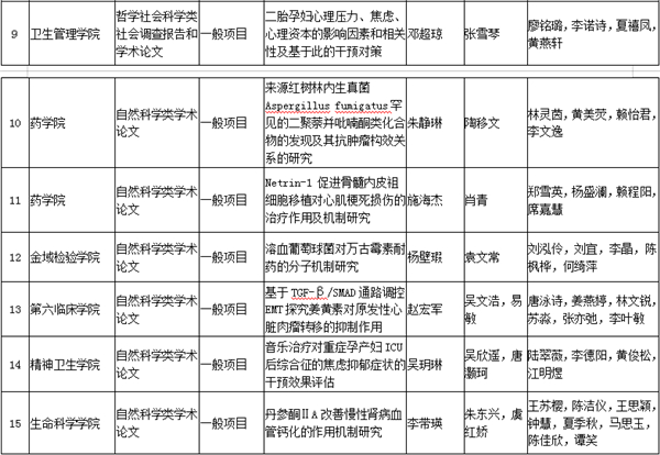 在获得立项资助的15个项目中,ac米兰南山学院2018级吴相荣同学的《基于免疫细胞分型的机器学习预测肺癌预后和复发风险》被评为“重点项目”并获得4.5万元资助,获得立项的还有:第二临床学院2项、第三临床学院2项、口腔医学院1项、基础医学院1项、公共卫生学院1项、卫生管理学院1项、药学院2项、金域检验学院1项、第六临床学院1项、精神卫生学院1项、生命科学学院1项。