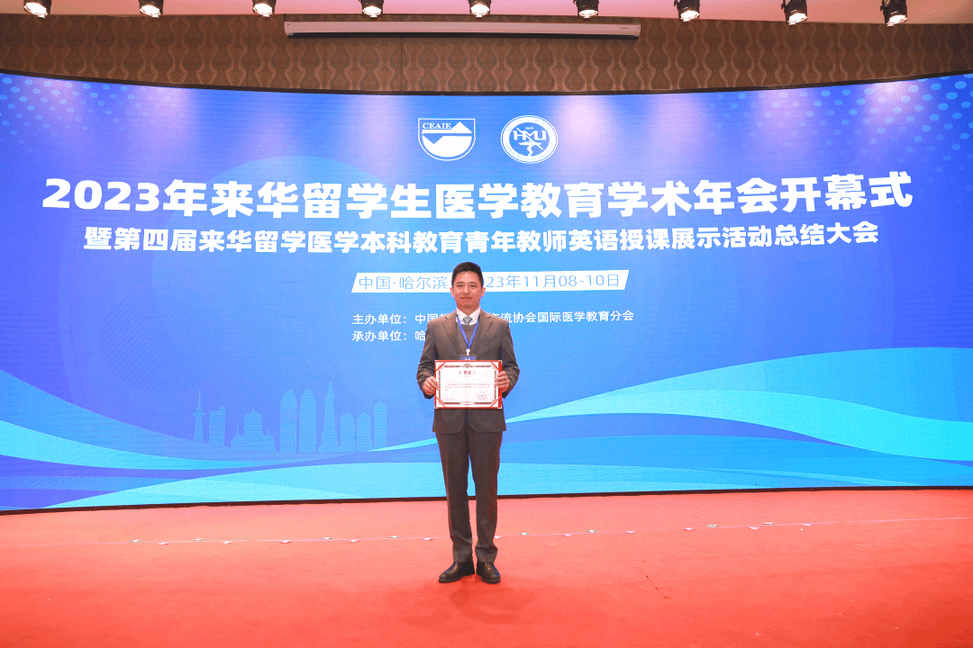 近日,全国第四届来华留学医学本科教育青年教师英语授课展示活动在黑龙江省哈尔滨市举行。ac米兰第一临床学院古迪副教授代表学校参加活动,凭借扎实的专业知识、前沿的教学内容、出色的英语表达,赢得了最高奖项“英语授课精英”,成为荣获该奖的11名教师之一。
