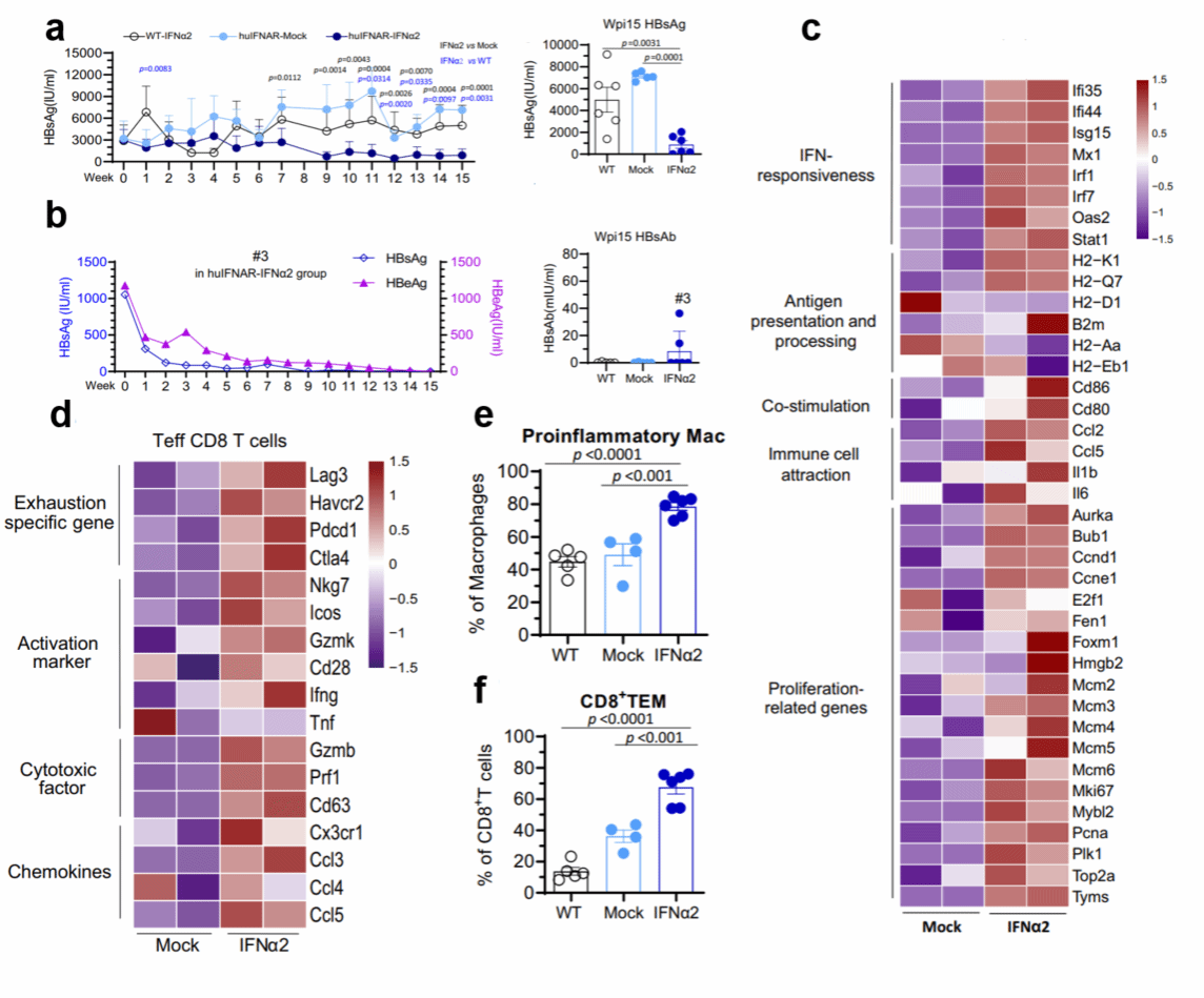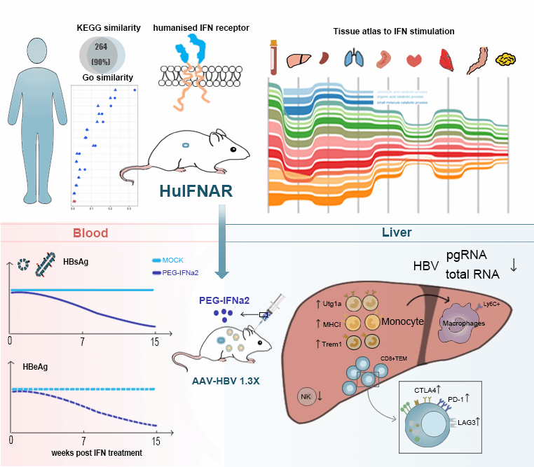 该研究建立的huIFNAR小鼠能够真实地响应人干扰素刺激,同时在该模型中发现PEG-IFNα2治疗成功抑制肝内HBV复制,实现HBsAg血清转化,该小鼠模型为研究干扰素体内的功能和评估干扰素实现HBV功能性治愈机制提供了平台(图5)。