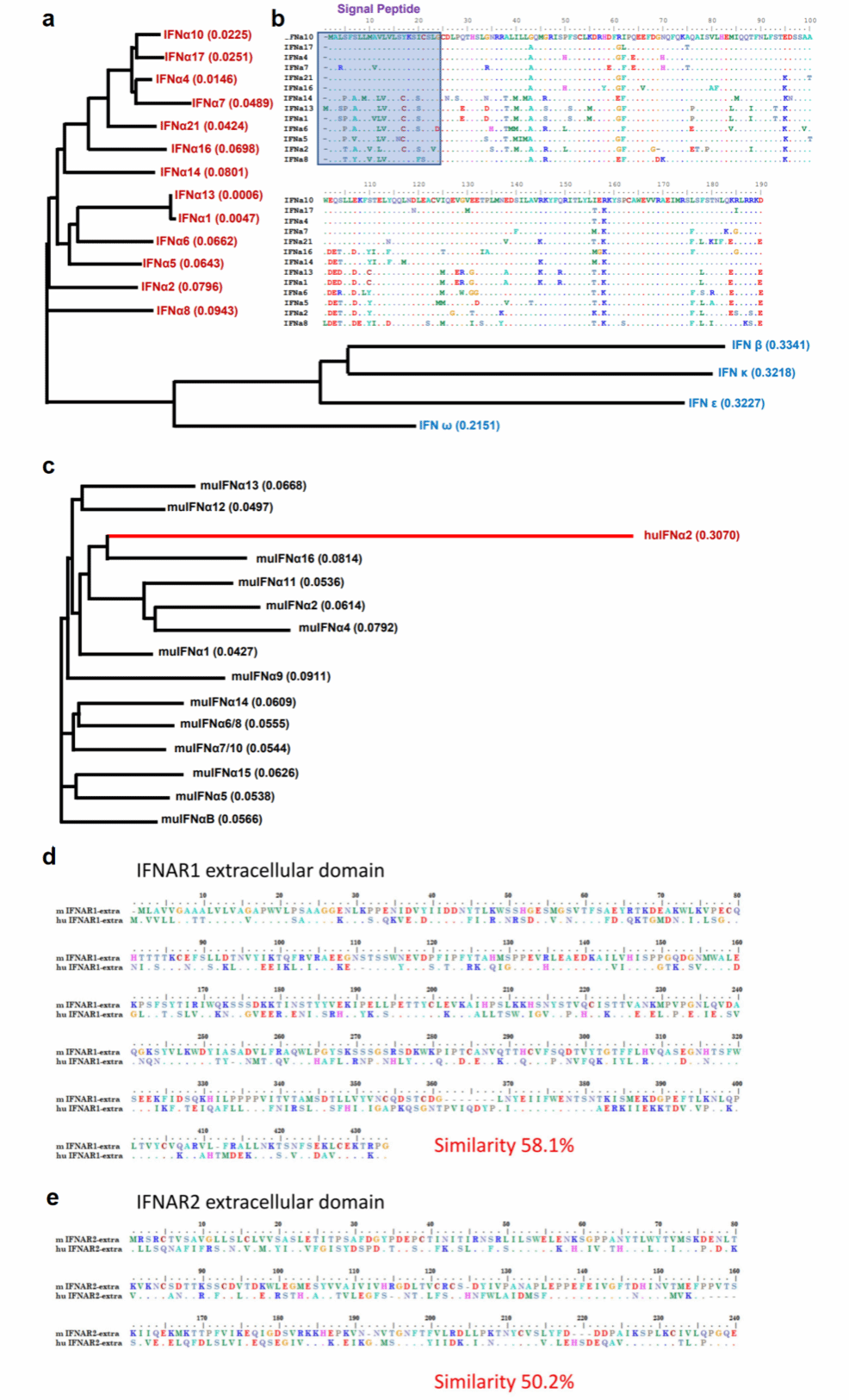图1 I型干扰素序列比对以及人和小鼠I型干扰素受体胞外结构域氨基酸序列比对