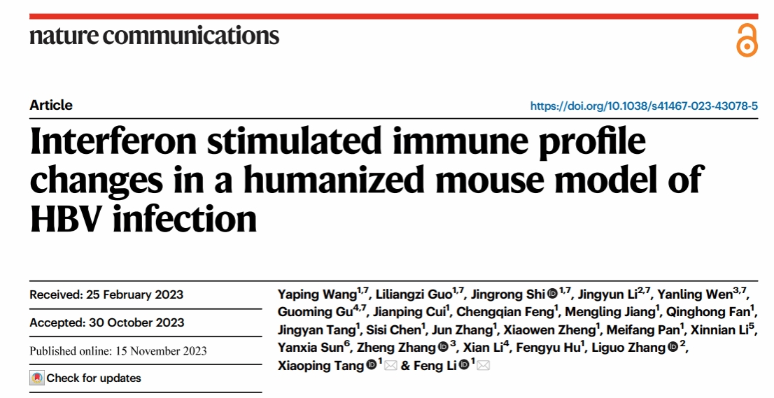 近日,ac米兰官方网站附属市八医院李锋教授、唐小平教授团队联合中国科学院生物物理研究所张立国教授团队和深圳三院国家传染病临床研究中心张政教授团队在Nature Communications杂志发表慢乙肝干扰素功能性治愈研究的最新成果:“Interferon stimulated immune profile changes in a humanized mouse model of HBV infection”。该研究成功构建了一种能真实应答人干扰素的huIFNAR小鼠模型;分析得到人干扰素的组织特异性应答谱;在该小鼠模型中证明干扰素能够降低血清HBsAg水平,并发现特定细胞类型可能在实现HBV治愈中起到重要作用。