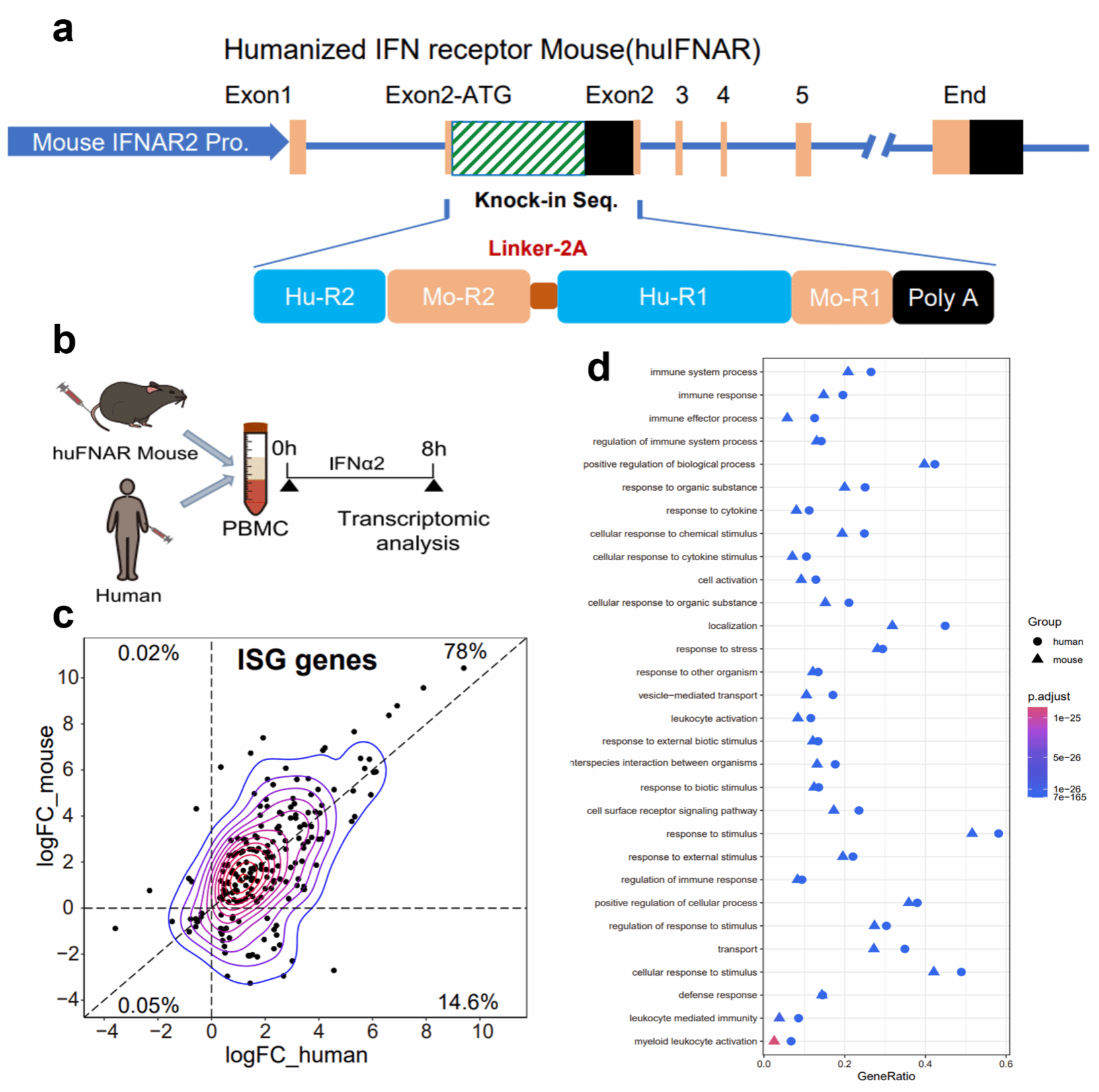 图2 huIFNAR敲入策略示意图以及huIFNAR小鼠与人PBMCs对人IFN刺激反应的相似性分析