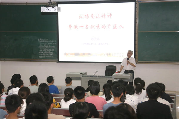 广医在线讯 11月5日,在主题为“弘扬南山精神 争做一名优秀的广医人”的课堂上,学校党委书记冉丕鑫教授向2020级临床医学专业的同学们阐述了南山精神的丰富内涵与弘扬大学精神的重要意义,号召同学们以钟南山院士为代表的优秀广医人为榜样,勉励同学们敢于担当、争创优秀,为中华民族伟大复兴贡献青春力量。