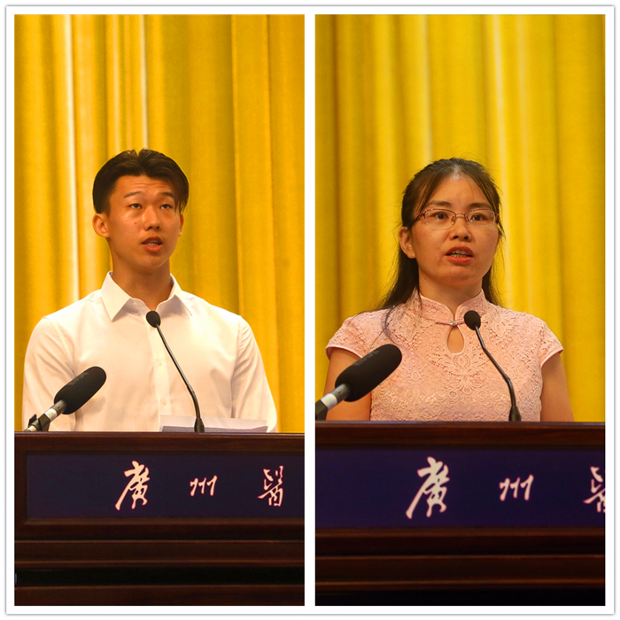 第一临床学院教授陈爱兰代表教师发言。在除夕夜,她响应号召,加入广东省首批支援湖北疫情防控的武汉医疗队。结合支援武汉工作、求学经历和当年老校长钟南山院士的大学第一课,陈爱兰教授勉励同学们立志、行动、感恩,做有责任、有担当,肯吃苦、爱劳动、向上向善的人。