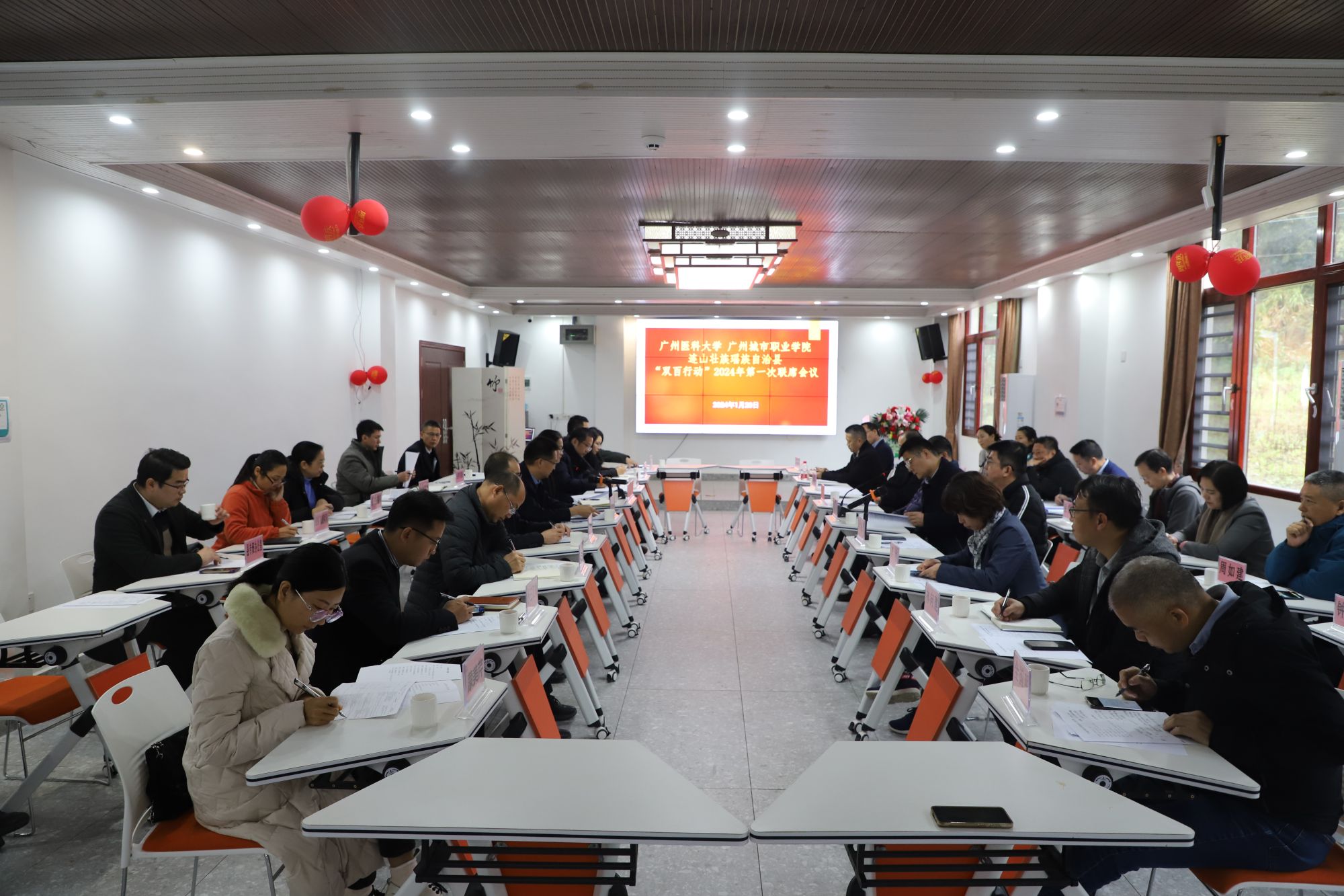 为进一步推进“双百行动”与全口径全方位融入式帮扶连山基础教育工作走深走实,1月20日,校长赵醒村、党委副书记陈晓辉,以及办公室、医院管理处、教务处、工会、教师教学发展与研究中心、附属清远医院相关负责人等赴连山县与广州城市职业学院,连山县委、县政府召开“双百行动”2024年第一次三方联席会议。