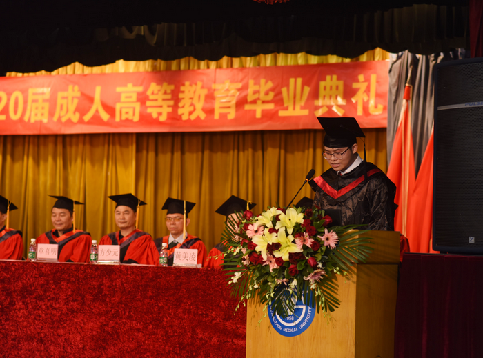 曾思涛同学作为优秀毕业生代表发言,他回顾了在校期间老师的教诲,讲述了自身驰援武汉的经历,表示这段经历使他更加深刻地感受到广医人精神、南山风格带来的力量。