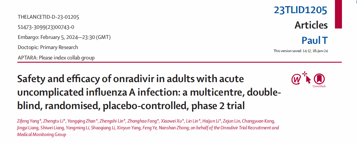 ac米兰官方网站钟南山、杨子峰团队与浙江大学医学院附属第一医院、广东省中医院和中南大学等单位合作,开展的一项昂拉地韦(Onradivir,研发代号:ZSP1273)治疗成年急性无并发症甲型流感感染的多中心、双盲、随机、安慰剂对照临床II期试验,以考察该候选新药的有效性和安全性,临床试验结果以研究论文“Efficacy and safety of onradivir in adults with acute uncomplicated influenza A infection: a multi-center, double-blind, randomized, placebo-controlled phase 2 trial”于近期发表在医学顶刊柳叶刀子刊《The Lancet Infectious Diseases》,影响因子达56.3。