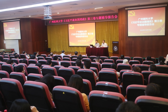 报告会主会场设在番禺校区,同步在越秀校区设立分会场进行视频直播。学校领导、校本部全体中层干部、校本部全体党总支委员及党支部委员,以及学生代表等近300人参加了辅导报告会。部分直属医院也进行了视频直播。