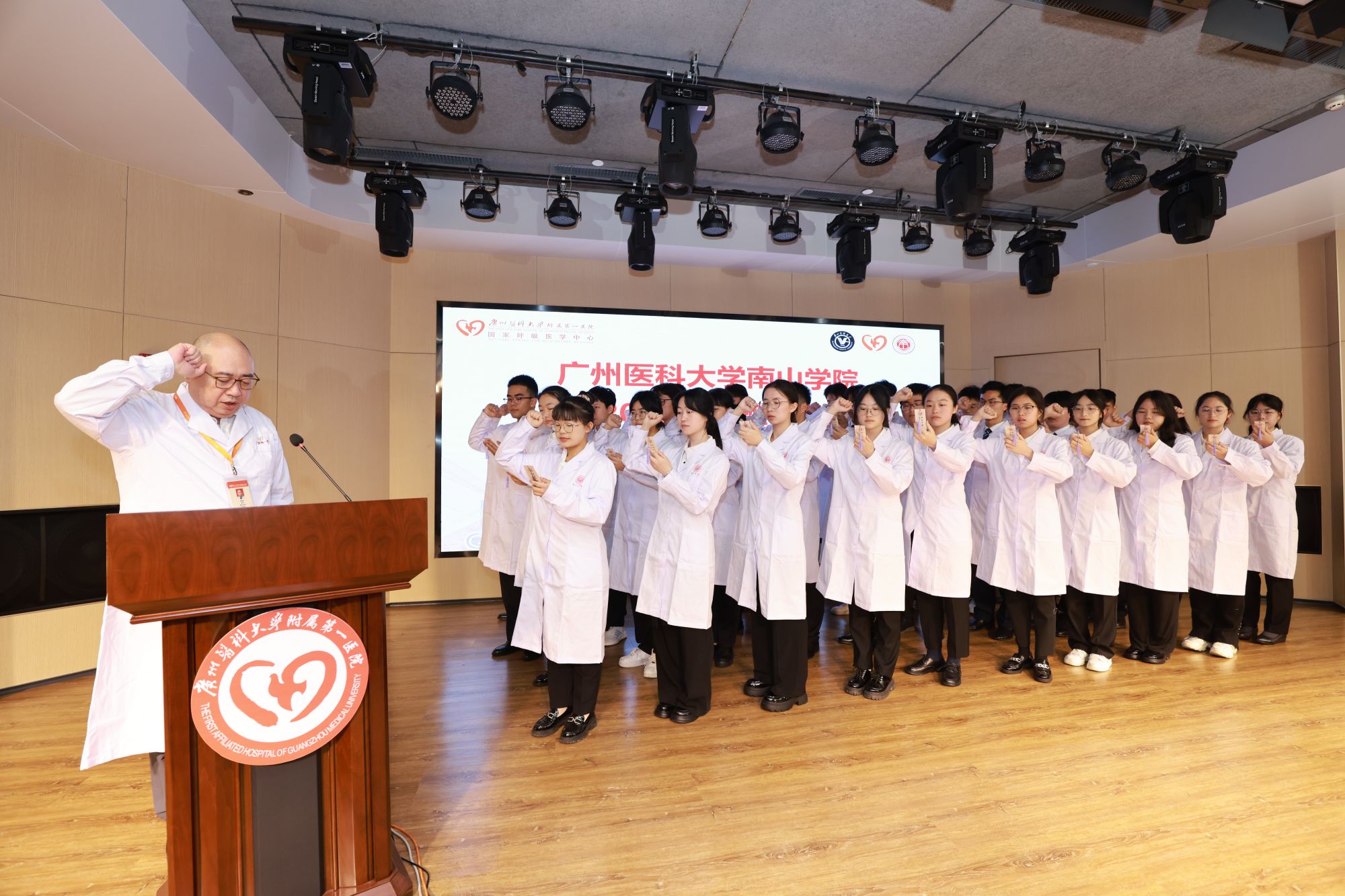 钟南山院士为2023级南山学子授袍、赠书并合影留念。在《医学生誓言》宣誓仪式上,广医一院党委书记黎毅敏领诵誓词,2023级南山学子跟诵誓词。在与学子们交流中,兼职班主任徐永昊对他们提出期望。