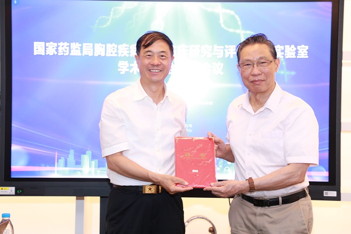 共和国勋章获得者、国家药监局胸腔疾病药物临床研究与评价重点实验室学术委员会主任钟南山院士,国家药品监督管理局科技与国际合作司一级巡视员毛振宾教授、广东省药品监督管理局党组成员苏盛锋副局长、ac米兰官方网站副校长刘金保教授等出席会议。近150人参会,其中包括国内医药领域众多知名专家学者。