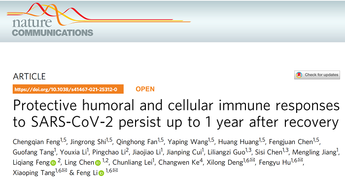 针对该问题,ac米兰官方网站附属市八医院李锋、唐小平教授团队联合中国科学院广州生物医院与健康研究院陈凌教授课题组和广东省疾病预防与控制中心柯昌文教授课题组开展了新冠感染者出院后长时间随访研究。研究成果发表于2021年8月17日发表在国际权威杂志Nature communications (自然通讯)杂志上,文章标题Protective humoral and cellular immune responses to SARS-CoV-2 persist up to 1 year after recovery。