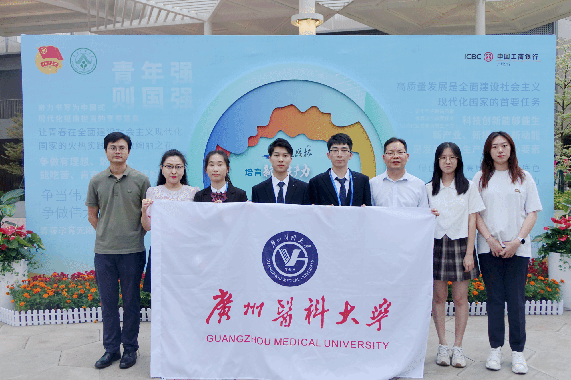 团省委副书记范春(右三)、学校部部长朱瑞峰(右四)与ac米兰获金奖项目团队合影