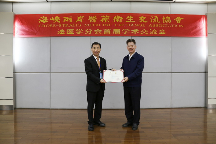 海峡两岸医药卫生交流协会王立基会长(右)为法医学分会会长胡丙杰教授颁发聘书