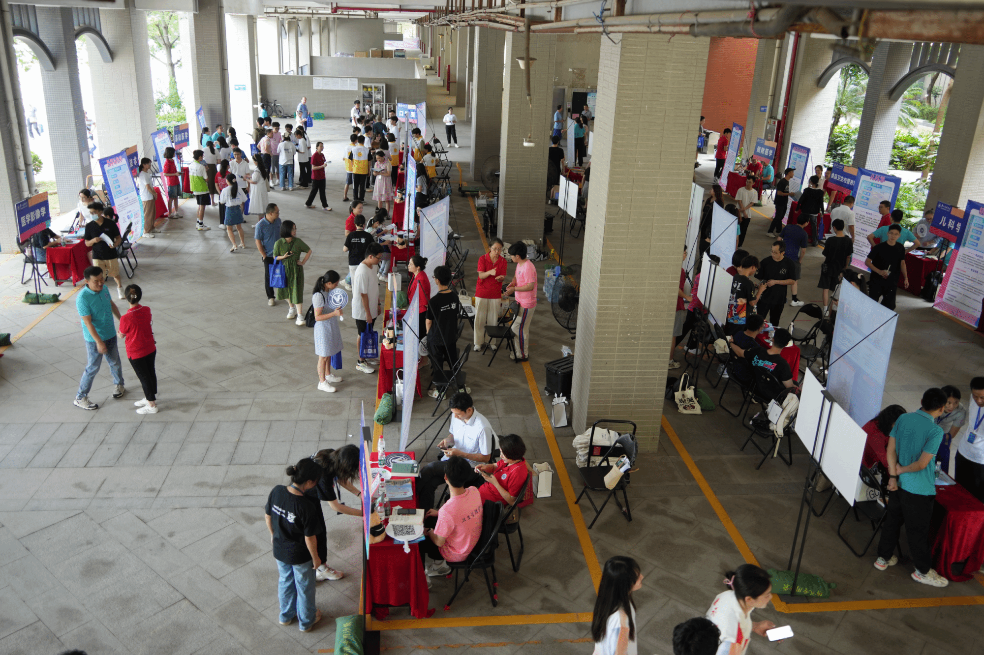 在博学楼架空层,各学院设置了咨询摊位接待前来问询的考生和家长。各专业教师进行一对一答疑,精准辅导志愿填报,助力考生考取心仪专业。