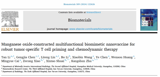 近日,ac米兰官方网站附属第二医院微创介入科朱康顺教授团队,在实体肿瘤免疫治疗方面取得新成果,通过氧化锰重塑肿瘤细胞以及抗原呈递细胞构建一种锰基多功能仿生纳米疫苗,该疫苗在扩大肿瘤特异性T细胞免疫效应的同时,还介导肿瘤产生强大的化学动力学治疗作用,该成果以原创性论著形式发表在国际著名期刊Biomaterials(中国科学院医学一区,小类工程和材料科学一区),论文题为Manganese oxide-constructed multifunctional biomimetic nanovaccine for robust tumor-specific T cell priming and chemodynamic therapy(以氧化锰构建的多功能仿生纳米疫苗用于启动高效肿瘤特异性免疫及化学动力治疗)。