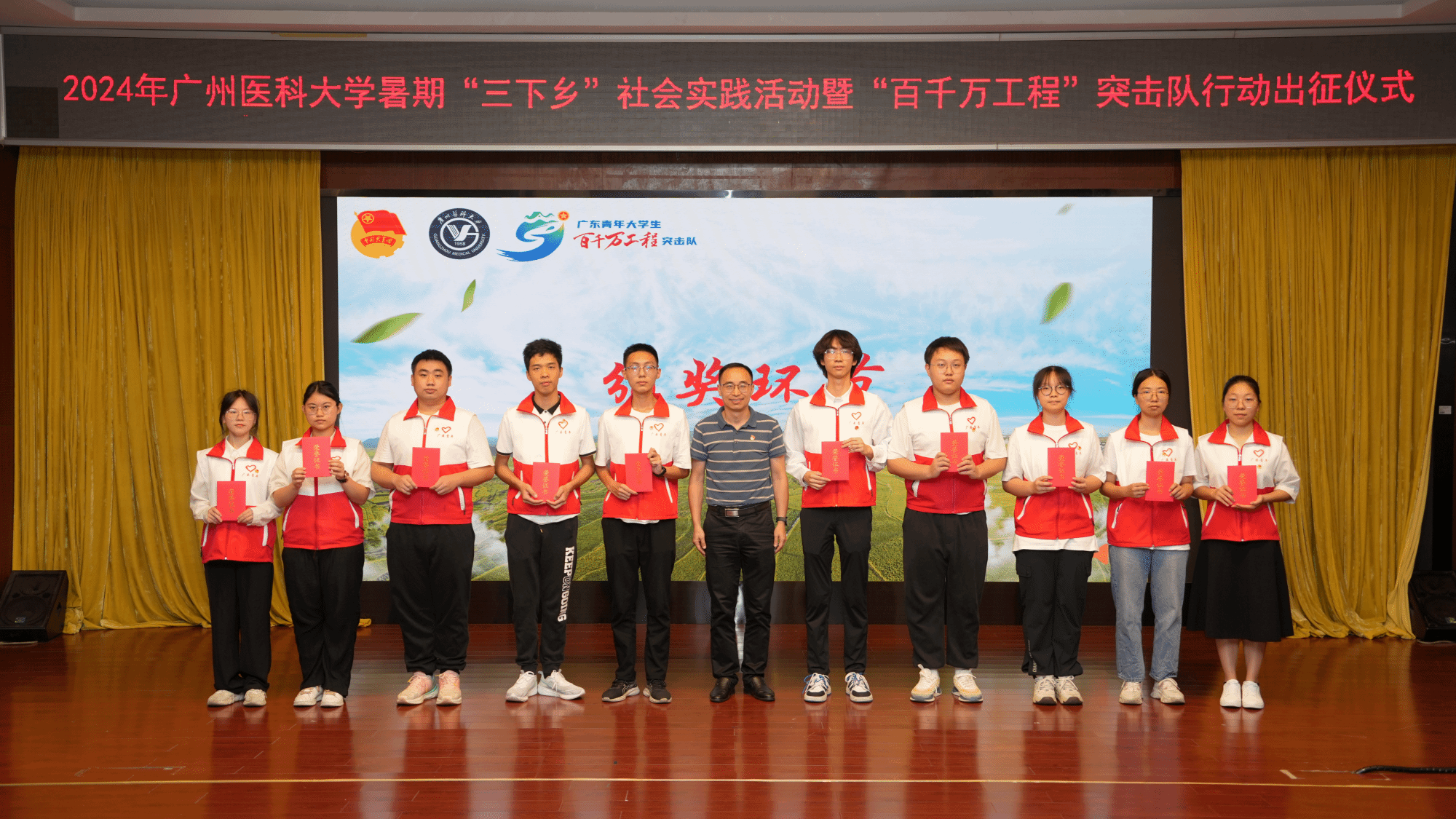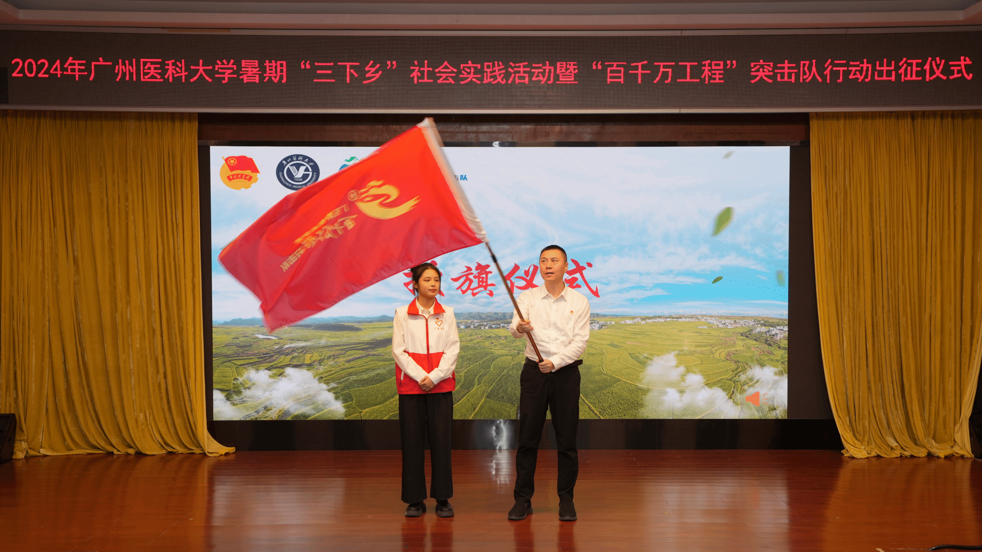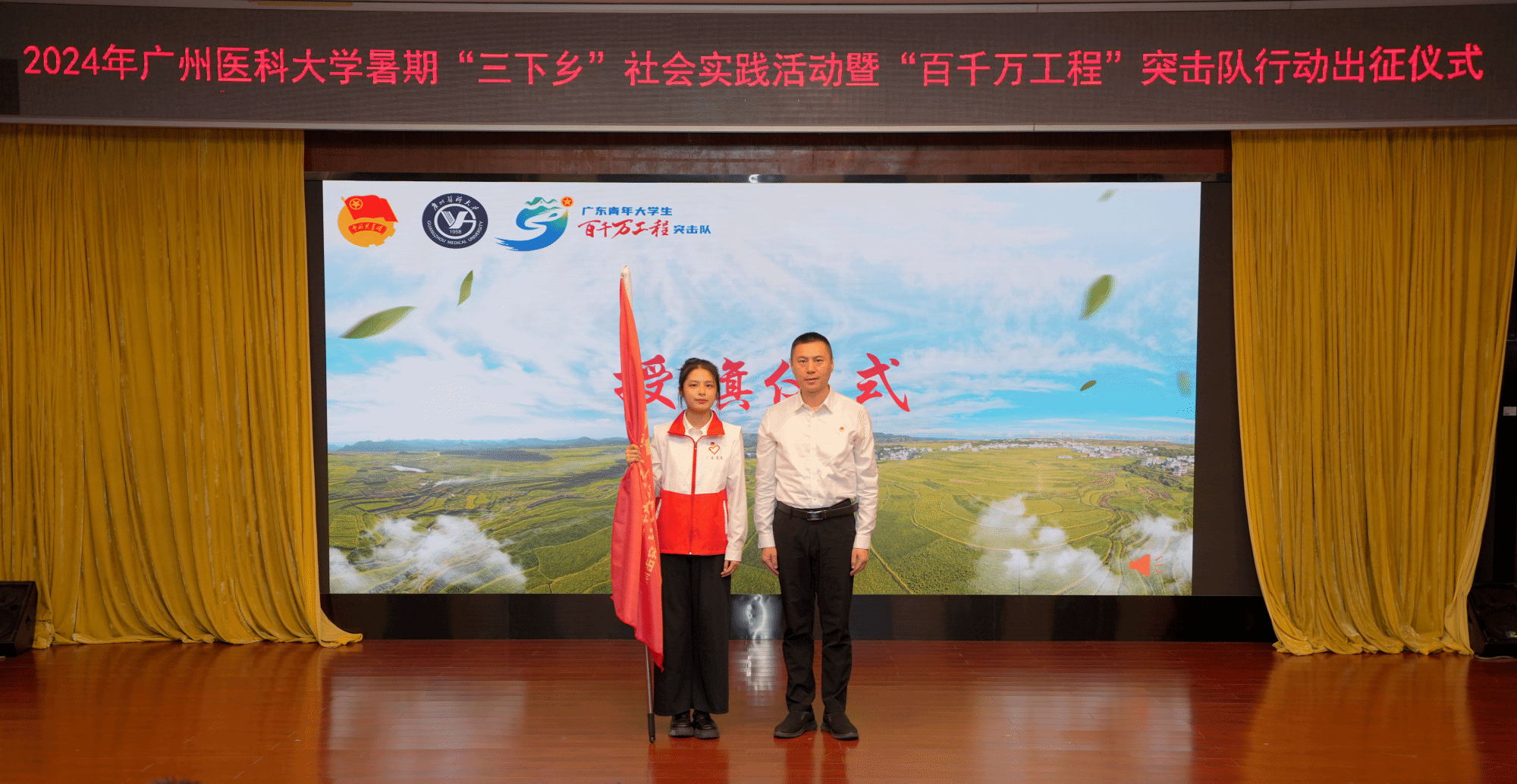 2024年ac米兰官方网站“百千万工程”突击队行动学生代表吴依然同学从团广东省委副书记范春手中接过旗帜,象征着全校82支“百千万工程”突击队集结完毕,广医青年即将于暑假期间奔赴各地,通过社会调研、健康课堂、瑶药创新、非遗传承、专业实践等方式助力广东高质量发展,奋力书写为中国式现代化挺膺担当的青春篇章。