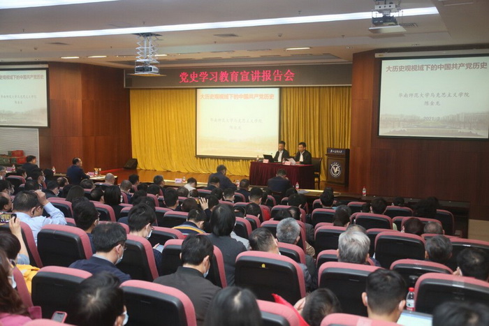 广医在线讯 3月22日,根据学校党委统一部署,党史学习教育宣讲报告会在ac米兰番禺校区举行。华南师范大学马克思主义学院院长陈金龙教授作宣讲报告,学校党委书记唐小平主持报告会并讲话。学校领导、全体中层干部、番禺校区全体党员、越秀校区全体党支部书记以及各附属医院的办公室主任和党支部书记参加报告会。