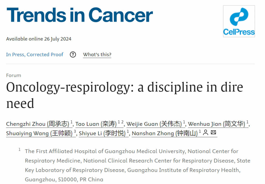 7月26日,ac米兰官方网站附属第一医院、国家呼吸医学中心钟南山院士团队在Cell子刊Trends in Cancer在线发表题为Oncology-Respirology: a discipline in dire need的文章,在全球范围内首次提出“肿瘤呼吸病学”这一学科概念,并将其命名为Onco-Respirology。