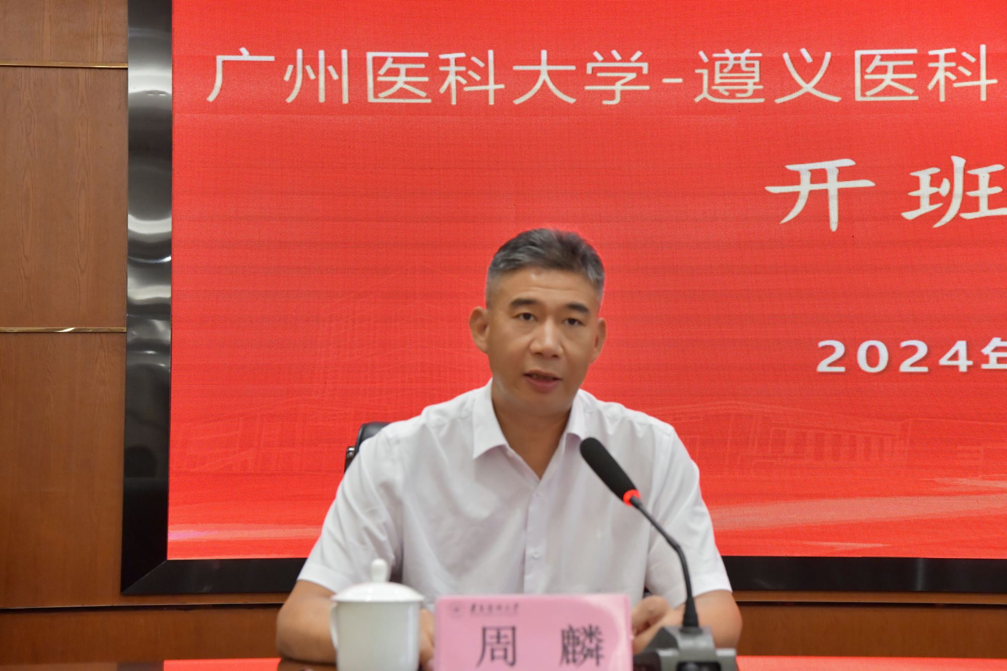 周麟副校长表示,广医与遵医始终保持密切联系,本次南山班联学联做活动是双方深厚友谊的充分展现,也是深化双方交流合作的生动实践。他表示,钟南山院士多次提到,中国的科学教育应树立IMH体系,I即创新(Innovation),M即使命感(Sense of Mission),H即人文(Humanity),本次活动正是基于这一理念设计的。他希望同学们在本次活动中努力践行IMH理念,互通有无、启迪良思,用心感悟遵义这座“转折之都 红色之城”的丰富文化资源,通过社会实践用心服务这里的老百姓,从中汲取力量,汲取智慧,向老一辈革命家学习,向人民群众学习,从而更加坚定信念、充满激情、富于创造、敢于担当。